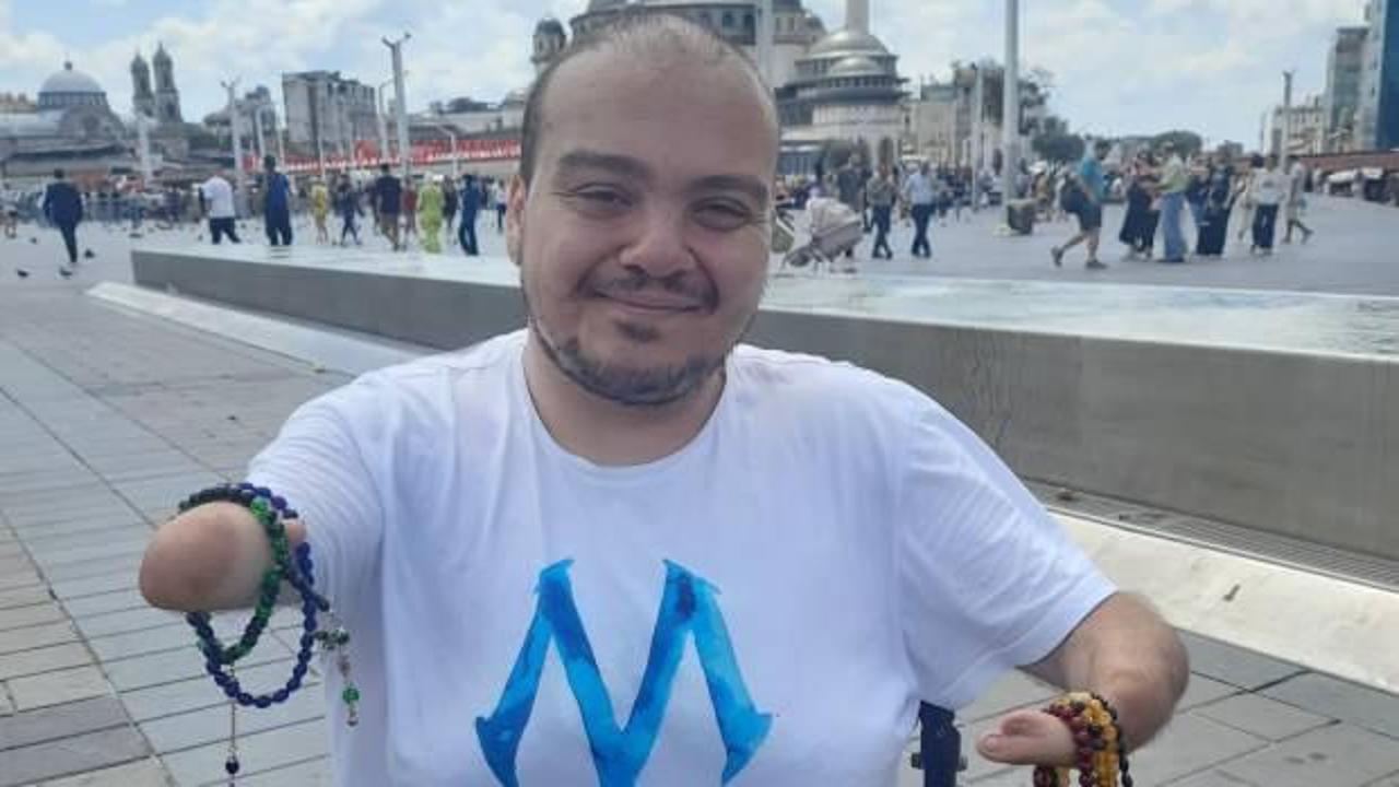 Sosyal medyada “Engelsiz Kartal” ismiyle paylaşımlar yapan Emre isimli engelli genç, geçimini İstanbul'da tesbih satarak karşılıyor.
